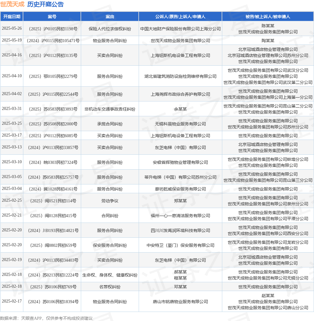 本站消息,根据天眼查APP显示,近日公布了一则世茂天成物业服务集团有限公司作为被告/被上诉人的开庭公告,详细内容如下: